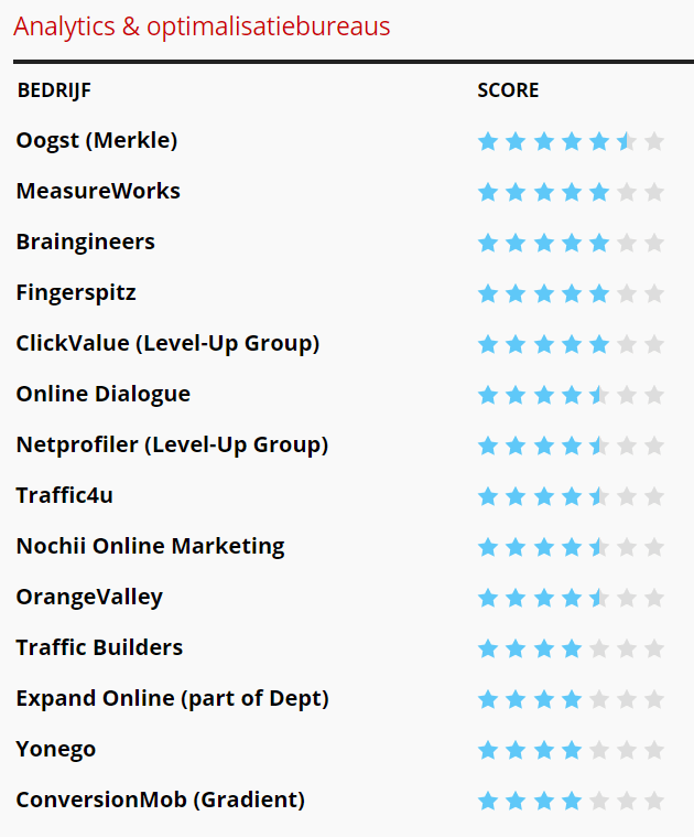 Do not feel discouraged when going through the list below; analyzing the “Emerce 100” Best Dutch (top 14) digital agencies, exactly half of them scores unsatisfactory, with a PageSpeed Insights score between 17 and 41 percent. Only one optimization agency (and the only one without CMS) gains green figures (90-100%) with a 97% score.