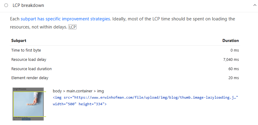 At the time of my LinkedIn post 5 years ago, Lighthouse wouldn't show LCP breakdown. But it does today and here's what the subpart breakdown shows (see screenshot):