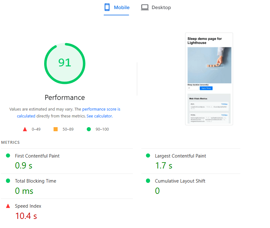 So what did Lighthouse report when forcing a delay of 7 seconds via PHP's sleep function?