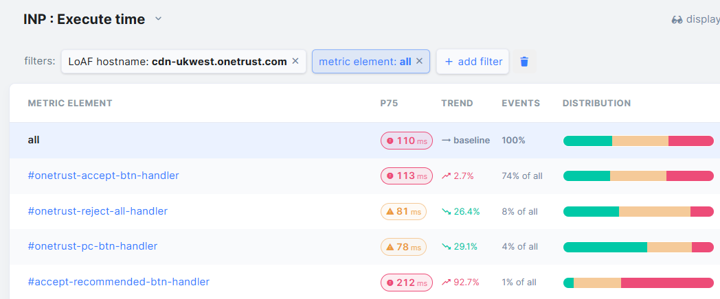 #onetrust-accept-btn-handlerhas a more challenging distribution (only 31% ending up in good responsiveness and 31% poor responsiveness) with mobile P75 processing time being 113 milliseconds#onetrust-reject-all-handlershows slightly healthier distribution (37% ending up in good responsiveness and only 15% poor responsiveness) with mobile P75 processing time being 81 milliseconds